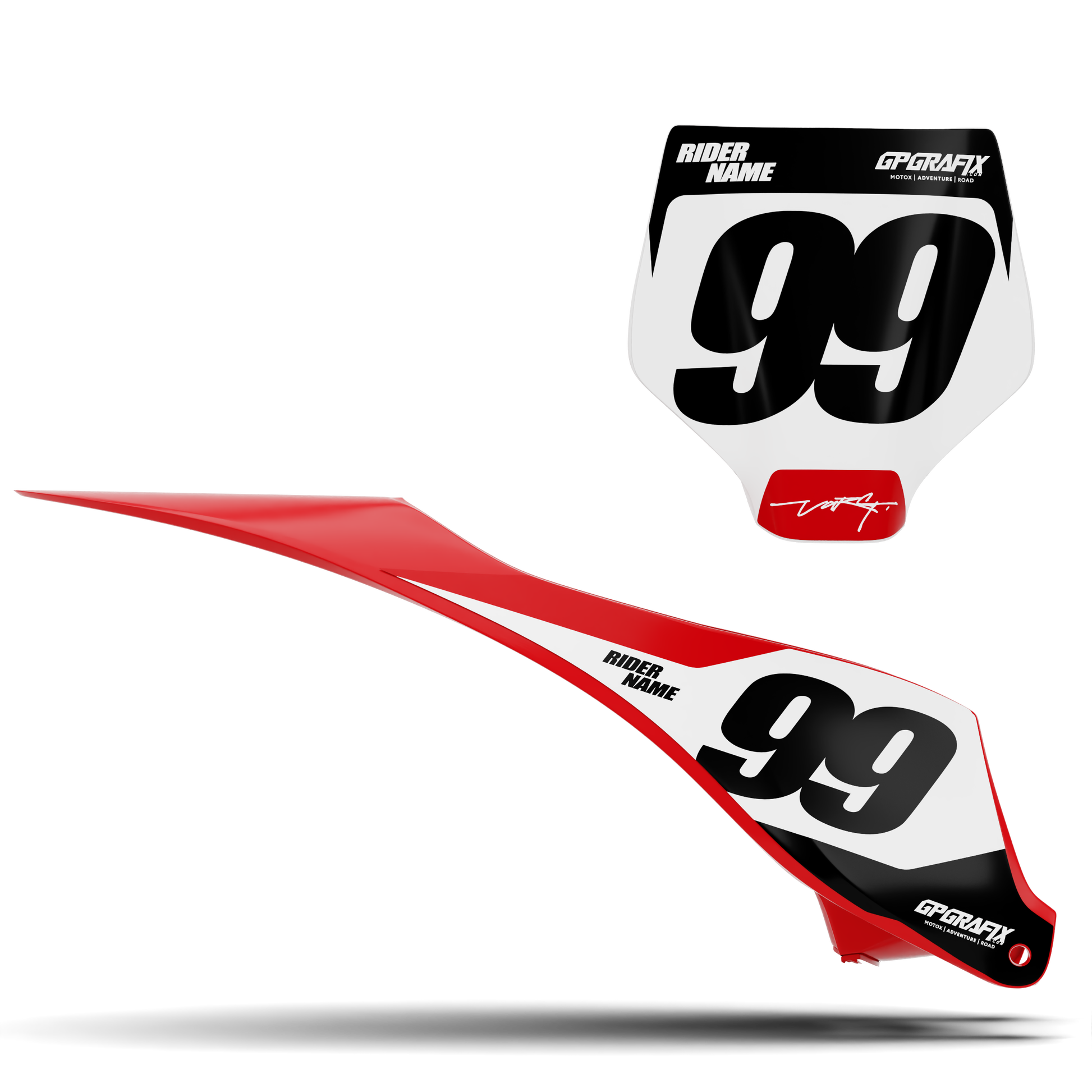 Using the order menu please provide us with your bike model, cc and year. Enter your rider name and number, name and number fonts and number/background colours. If no name/number is required, please input ‘No’. You can also upload any logos that you would like added to your graphics. Wether it be a personal sponsor or just for fun!